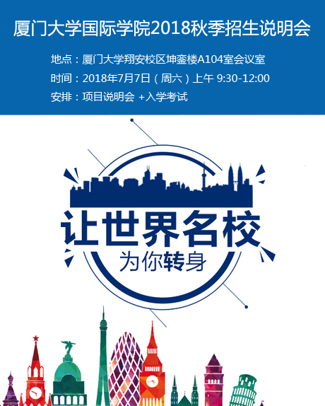 为了帮助广大的高考考生及家长进一步了解国际学院及今年的招生计划,学院将于2018年7月7日(本周六)上午在厦门大学翔安校区坤銮楼A104会议室召开招生说明会。