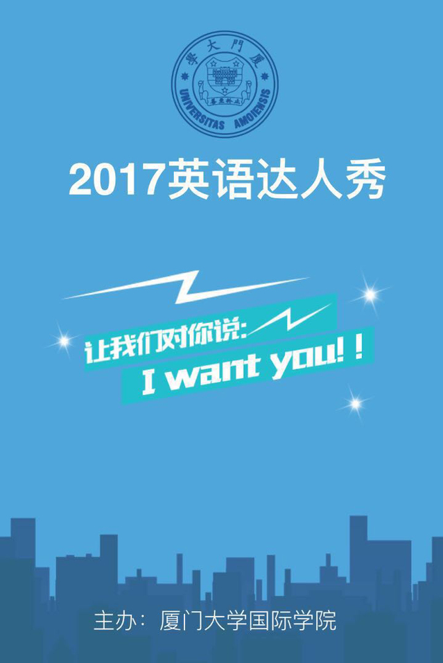 在这里,各位英语达人们不仅可以相互交流、同台竞技,还有机会到厦门大学参加决赛赢取万元大奖。英语达人们,你还在等什么?这个四月,厦大“2017英语达人秀”,点燃激情,放飞梦想,I want you!