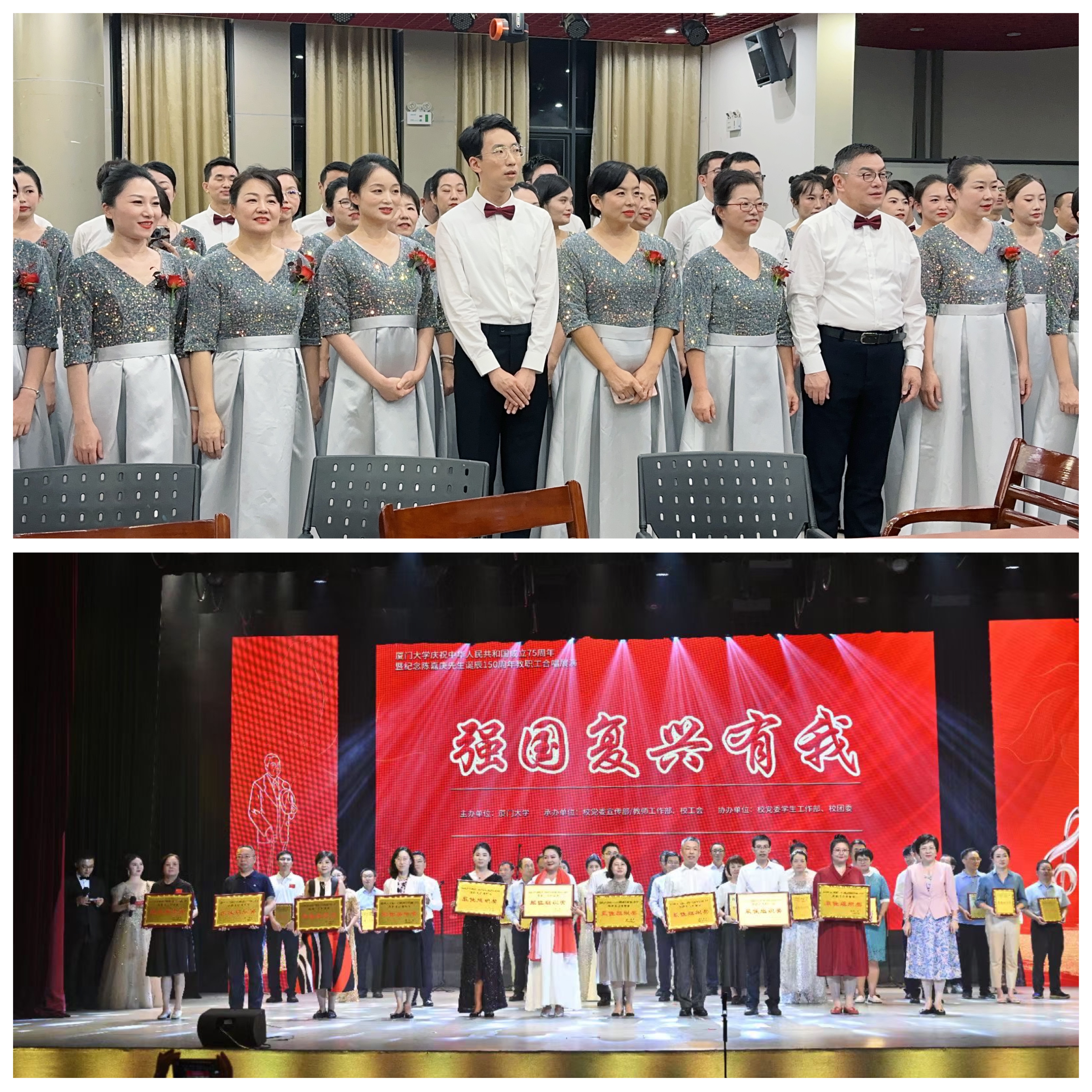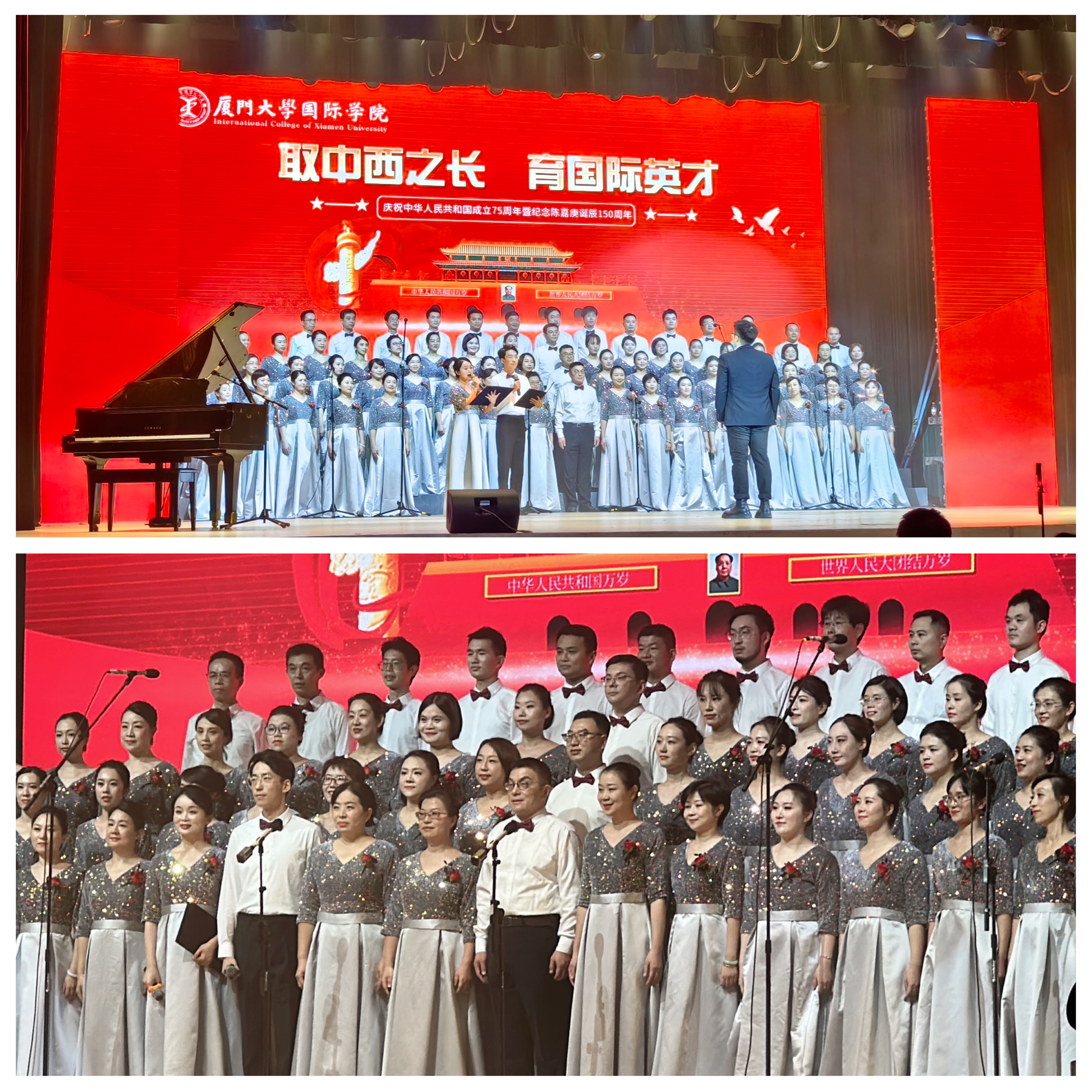 9月29-30日厦门大学庆祝中华人民共和国成立75周年暨纪念陈嘉庚诞辰150周年教职工合唱展演在建南大礼堂隆重举行。全校共39支队伍参演,数千名教职工深情放歌,用激昂的歌声唱响对祖国的热爱及对校主陈嘉庚先生的缅怀国际学院合唱团深情演唱《我和我的祖国》,用歌声祝愿祖国繁荣昌盛,荣获“最佳人气奖”和“最佳组织奖”