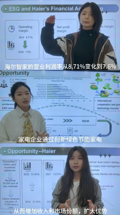 比赛现场,面对来自国内外的专业评委与顶尖高校对手,崔馨伊、张菱栩、李宜倩三位同学沉着冷静,以流利的英语、严谨的逻辑和独到的见解,系统阐述海尔智家在环境、社会、治理维度的创新实践,充分展现出国际学院学子扎实的专业功底与国际化视野,赢得了评委的高度认可。