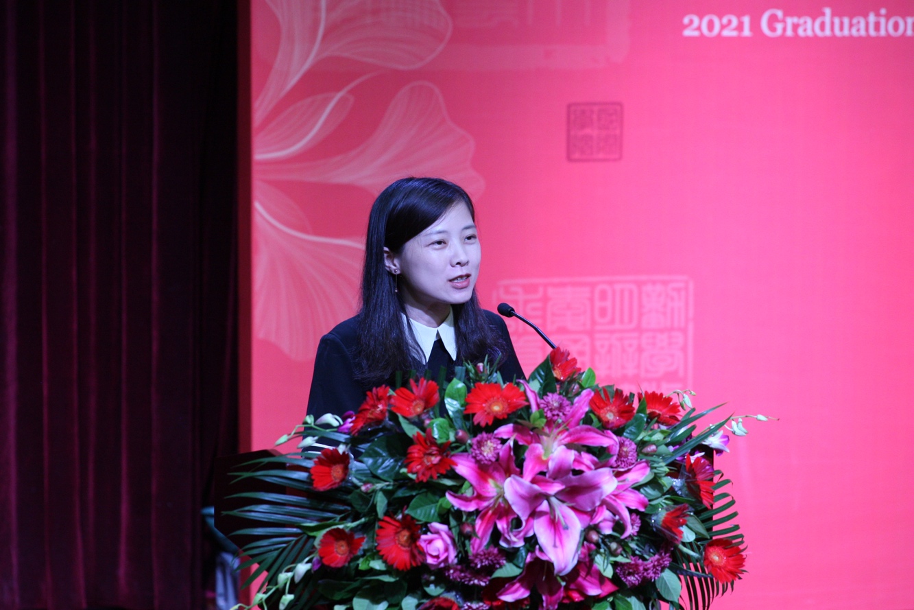 随后,教师代表杨晶副教授发言。她对同学们四年来努力奋斗取得的累累硕果表示祝贺,她指出,大学不仅是学习“如何与自己相处、如何与他人相处”,最重要的是养成终身学习的习惯。她希望同学们能始终秉承厦大校训,拥有淋漓尽致的人生。