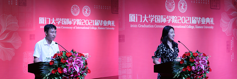 谢宇崧、姚佳彤作为毕业生代表依次发言。谢宇崧作为厦大研究生支教团的一员,在毕业后将赴西部支教。他表示,作为一名党员,他会努力接好接力棒,参与精准扶贫、融入巩固和拓展脱贫攻坚成果、全面推进乡村振兴的伟大事业,为祖国西部建设事业添砖加瓦。姚佳彤表示,非常幸运能在这样一个繁荣昌盛、和谐富强的新时代成为一名厦大学子,和广大师生一起见证中华人民共和国成立70周年、厦大建校百年及中国共产党成立100周年。大学四年,母校教会她的不仅是专业知识的积累和工作能力的提升,还教会了她如何做一个正直的人,做一个懂得感恩、懂得回馈社会的人,做一个积极响应党和国家号召的人。作为新时代青年,他们将肩负起中华民族伟大复兴的使命,站在世界大舞台上,迎接新时代挑战。