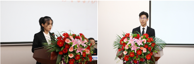 2019级中日本科项目的洪羽欣和2018级预本硕连读项目国际金融专业的高子淳作为学生代表依次发言。他们回溯了自己在国际学院的求学生活,并向各位辛勤工作的领导和老师,致以最衷心的感谢和最崇高的敬意。从小热爱日本文化的洪羽欣表示,在日语组老师的关心和指导下,同学们不仅顺利通过了日本院校的编入考试,还有多人获得了日本静冈产业大学的奖学金。即将赴英国埃塞克斯大学续读本科的高子淳表示,学院优质的师资队伍及中英文相结合的教学模式不仅使学生们更好的适应国外课堂的语言环境,还锻炼了英语能力。教师们的悉心教导、在升学择校时给出的中肯建议,都让他受益匪浅。在国际学院,他学会的不仅是理论知识和学习技能,还学会了严谨的治学态度和做人的道理。