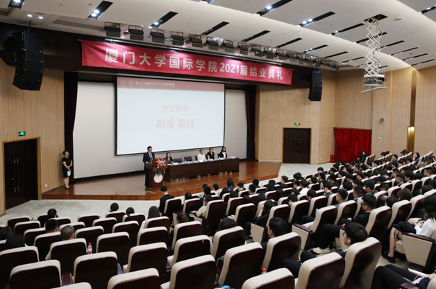 结业典礼在雄壮的国歌声中拉开帷幕。院长陶涛代表学院致辞,他首先为2021届顺利结业的同学们送上了最热烈的祝贺和最美好的祝愿,向辛勤耕耘的学院全体教职员工和学生家长们表示最崇高的敬意和最衷心的感谢。他简要回顾了厦门大学的百年发展历程,指出在中国共产党的领导下,如今的厦大获得了飞速的发展,不但实现了成为南方之强的办学目标,还正迈着大步走向世界一流。2021届同学们不仅有幸见证了厦大的百年校庆,又即将见证建党百年,他们的典礼具有不同寻常的意义,对此,他对学生提出了三点希望:一是希望同学们永葆进取之心,秉承厦门大学“自强不息、止于至善”的校训,把学习当作一种追求卓越的品质,做一个善学的人;二是希望同学们始终保持开阔的视野,包容的心态。在今后的留学生活中以开阔的胸襟学习多元文化,同时保持充分的文化自信,展示良好的国家形象;三是希望同学们长存善心,心怀感恩。帮助那些需要帮助的人,传承厦大人“知无央,爱无疆”的大爱精神。