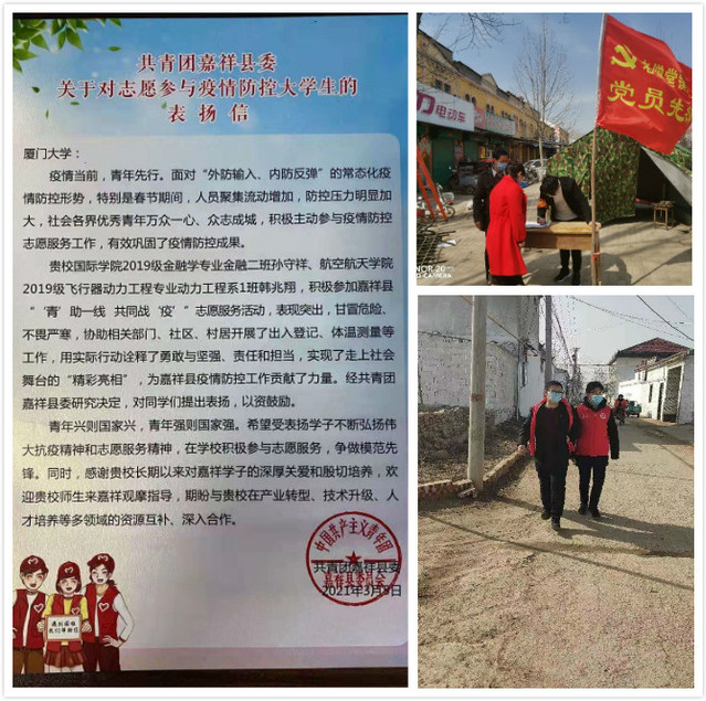 近日,我校收到共青团嘉祥县委发来的表扬信。信中表示,面对“外防输入,内防反弹”的常态化疫情防控形势,我院2019级金融专业孙守祥在2020年和2021年春节期间,甘冒风险,不畏严寒,协助相关部门、社区、村居开展出入登记、体温测量等工作。用实际行动诠释了勇敢与坚强、责任与担当,为疫情防控贡献了自己的力量。来信对我院孙守祥同学不畏疫情、自愿参加疫情防控志愿服务工作表示肯定,对孙守祥同学和学校表示的感谢。