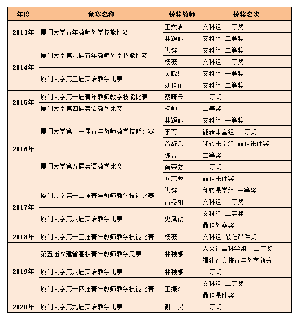 厦门大学教学比赛由教师发展中心、校工会、教务处、教师工作部、人事处联合举办,是检验青年教师教学水平和培养新生代力量的重要平台。近年来,我院派出多位优秀青年教师参赛,均取得了不俗成绩。国际学院近年教师参赛获奖统计: