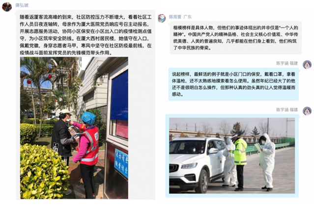 2017级会计一、二班围绕“榜样”的主题开展讨论,同学们备受抗疫英雄的鼓舞,内心充满了对祖国的热爱与奋斗的热血。陈翰同学说, “愈发感受到我们如今的生活有多少人为此付出了太多太多。他们有战争时期的英雄,有动荡时期的坚定创办学校的陈嘉庚,也有疫情中的‘逆行者’,还有很多默默无闻的奉献者”。梁丽仪同学说 “我们的生活是由很多人用他们的生命守护的。在厦大即将百年之际,我们应该感恩前人为我们提供的学习的环境和机会,也应感恩现在的‘逆行者’、‘守护者’。”