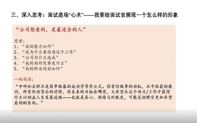 最后,游晨超分享了“申研和求职不是简单粗暴的成功学等价公式”、“真心、热情与匹配度,这可能是招聘官更加希望看到的东西”等重要的信息点。
