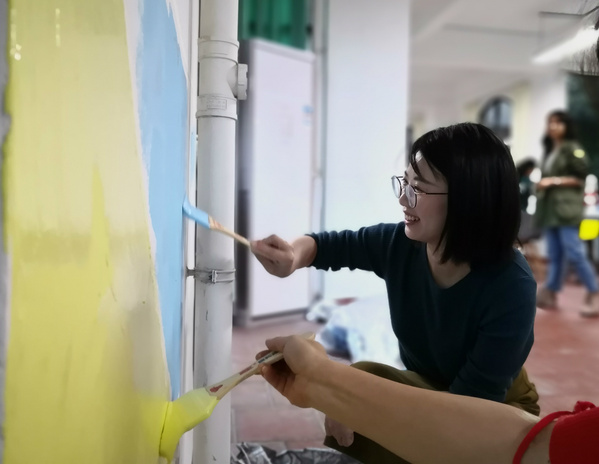 大学生创新创业实践是学校不断深化推进的一项重要工作,国际学院的“红树林团队公益教育”团队是第五届“互联网+”厦门大学校赛决赛金奖的得主,2016级的学生团队还获得了福建省大学生挑战杯特等奖的最佳成绩。在公寓园区设立“创新创业工坊”,必须要有时尚创新的气息,艺术设计出身的辅导员郭慧玲提出由学生亲自参与设计的大胆想法,工坊的门牌就交给他们,墙面要有轻快年轻的色彩,慧玲老师画好初稿计划交给学生们亲自动手参与粉刷。