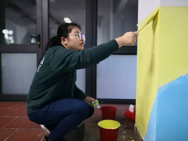 对学院负责管理的四个空间如何进一步细致美化,经过前期的多次碰头会,确定了设计稿后,正式开始装饰布置!罗书记带领辅导员们数次对宿舍园区连廊空间实地走访,党团活动室的设计成品上墙后,因消防刷不能遮挡,实际效果不美观。团委书记蒋玉塔带队去省里比赛时,还特意拍回团省委的消防栓美化图,设计师慧玲又重新修改设计。11月底,学院的辅导员和学生们在总设计师郭慧玲老师的指导下开始“创新创业工坊”墙面的上色工作。蓝色和黄色交叉格子的墙面绘制形式,色系青春活泼,充满活力,每个进入到“创新创业工坊”的同学都觉得眼前一亮。