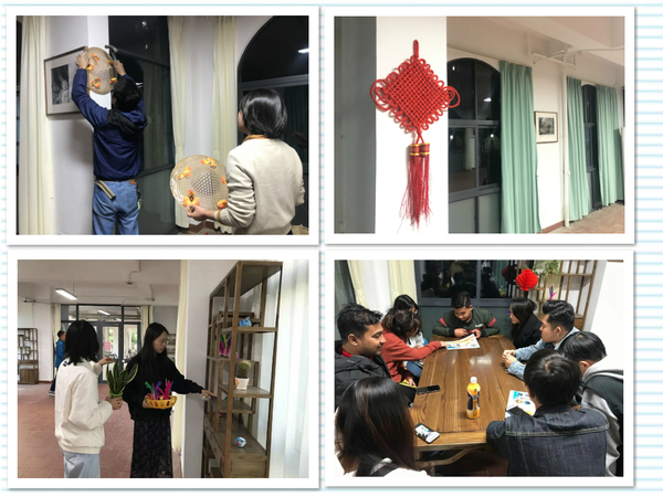中华文化体验室的装点也在同步进行,“五湖四海皆兄弟,海外国际一家亲”这幅挂在正门口的黄底红色毛笔字大对联,热烈欢迎每一位参与“汉语角”的海内外同学。