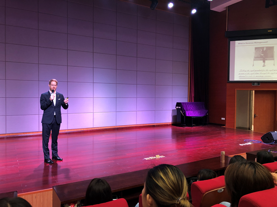Schmitt先生在讲座中,首先以简洁明了的方式介绍了收益管理的概念,并对合适的产品、合适的渠道、合适的价格、合适的时间以及合适的客户进行了清晰的阐述。随后又介绍了包括预测、优化、控制和监测在内的收益管理实施步骤、以及包括入住率(OCC)、平均房价(ARR)、每间可售房收入(RevPAR)的具体算法和实施收益管理的相关策略等。讲座过程中,Schmitt先生始终紧密结合康莱德酒店的实际运营情况,以生动具体的例子加深了同学们对收益管理在酒店经营决策中的重要性的认识,其富有逻辑、讲解到位、充分互动的演讲风格,给全体师生留下了深刻的印象。讲座在热烈的掌声中落下帷幕。