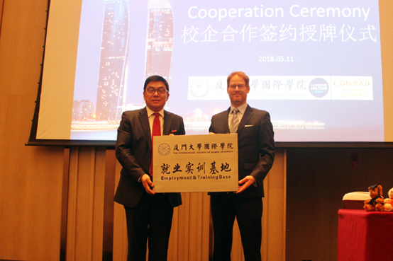 在与会人员的见证下,陶涛院长与康莱德酒店总经理Michael签署合作协议,并亲自为厦门康莱德酒店授牌,祝贺康莱德酒店成为我院“就业实训基地”,双方开启合作新篇章。
