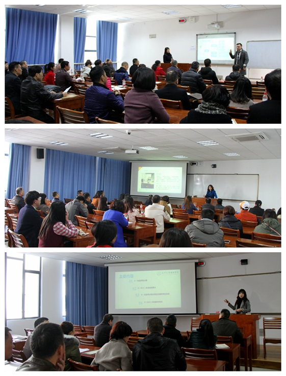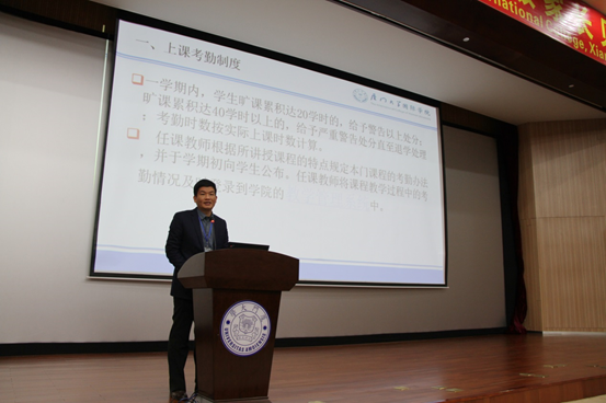 随后,国际学院专业教研组组长杨帅副教授上台发言,就学院专业设置情况、大一、大二升学要求、课程考核方式及成绩评定等方面向家长们做了详细介绍。学生事务科苏德辅导员介绍了学院学生管理规定以及家校配合的各项举措,并温馨提示家长们寒假期间需注意学生的安全,谨防诈骗事件的发生。