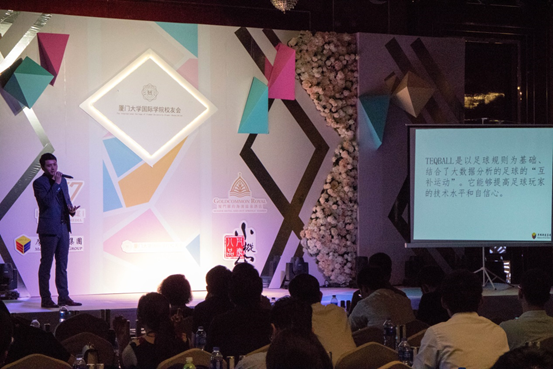 随后,校友们带着自豪依次上台介绍自己目前所从事的领域。任职于摩根斯达集团的周君儒校友介绍了一种关于足球的高科技—TEQBALL。TEQBALL不仅可以实现虚拟足球,让足球运动不再受到场地和天气的影响,还可以融合如排球、乒乓球等多种球类活动。大学生实习体验平台“酱油”的创始人廖宇星校友,介绍了他的互联网创业项目。目前仅在厦门该平台已有5万实名认证大学生,数千家通过认证的优质商户,为大学生在校期间提供众多优质的实践实习岗位。众多的优秀校友分享了各自的生活与工作经历,引来了台下观众的阵阵掌声。