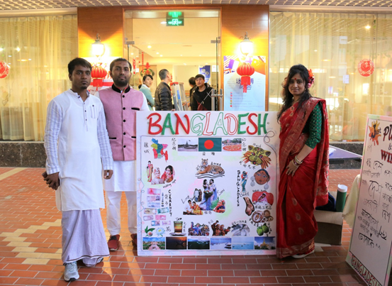 各个展位前的特色美食一字排开,日本的寿司人气高涨,韩国的炒年糕和泡菜饼美味诱人,秘鲁广受追捧的芝士土豆泥,越南精心准备了牛骨面和春卷,印度的咖喱套餐和尼日利亚的鳕鱼南瓜籽汤很快“光盘”,泰国的绿咖喱鸡和海鲜粉丝香气扑鼻。孟加拉国的展台不仅美食色香味俱全,而且亮丽耀眼的传统服装和小游戏都很好的展示了民族特色。