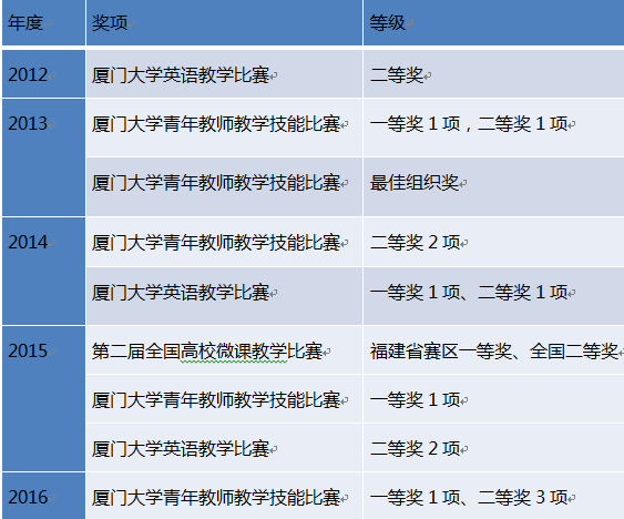 近日,厦门大学“第十一届青年教师教学技能比赛决赛暨第五届英语教学比赛”结果揭晓,国际学院教师代表队在比赛中脱颖而出,多名老师获奖。其中林颖婷讲师荣获青年教师教学技能比赛文科组一等奖,李莉讲师获得翻转课堂组二等奖,曾舒凡讲师获得翻转课堂组最佳课件奖。在英语教学比赛中,陈菁助理教授获得文科组二等奖,龚荣秀讲师获得文科组二等奖及最佳课件奖,为学院争得荣誉!