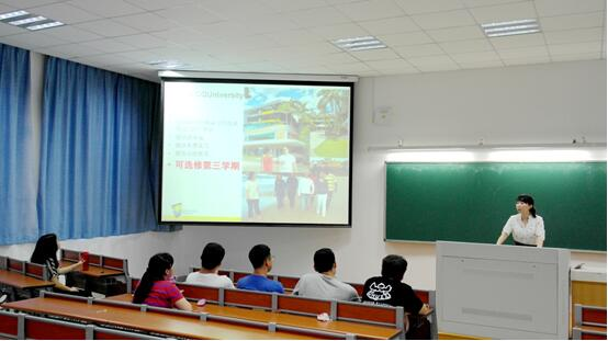 11月18日日下午,澳洲中央昆士兰大学国际部招生官员刘老师和中国区负责人Sonia老师在国际学院坤銮楼C402教室举办留学宣讲会,为我院预本硕连读项目大二、大三年级学生介绍了该校的基本情况及最新的澳洲留学资讯。