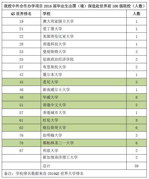 从升学质量看,今年成功申请到国(境)外大学就读的65名学生中,59人被QS世界排名前100名的大学所录取。相比上一届出国学生被世界前100名高校录取比例为70%的情况,今年我校中外合作项目出国学生被世界排名前100名大学录取人数和比例再创新高,占比超9成(90.7%)。具体录取学校及录取人数分布如下: