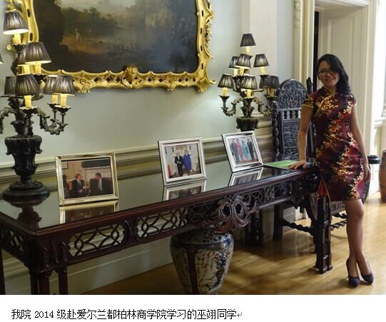 近日,我院2012级赴爱尔兰都柏林商学院学习的巫翊同学获得“国际学生大使”称号。在4月21日举行的“国际学生大使和爱尔兰政府奖学金”年度颁奖仪式上,她不仅接受了爱尔兰教育和技能部长简・奥沙利文的证书授受,还与中国驻爱尔兰大使徐建国交谈。