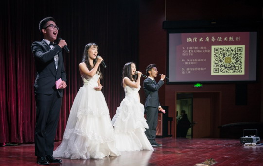 在中场休息环节中,晚会还设置了有趣的寻宝互动游戏以及激动人心的抽奖环节。参加互动的大一新生们还收到了14级学长学姐们饱含暖意的中秋月饼。特别值得一提的是,此次晚会设立了微信大屏幕,微信墙上同学们或祝福,或赞叹,或搞笑,为晚会添色不少。