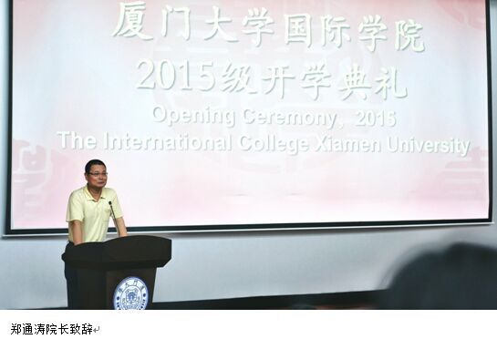 开学典礼在庄严的国歌中拉开帷幕。首先,院长郑通涛教授对新同学的到来表示了热烈的欢迎,并对新生们提出了两点要求:第一,少玩手机,不要把过多的时间放在游戏上,多投入精力在读书学习上。第二,改变学习习惯,尽快适应大学独立自主的学习环境。郑院长表示,国际学院为学生们提供了最好的教育模式和最好的学习环境,并且届届人才辈出,受到社会的一致认可,他希望通过大家的努力能把厦大国际学院办成全国最好的国际学院。