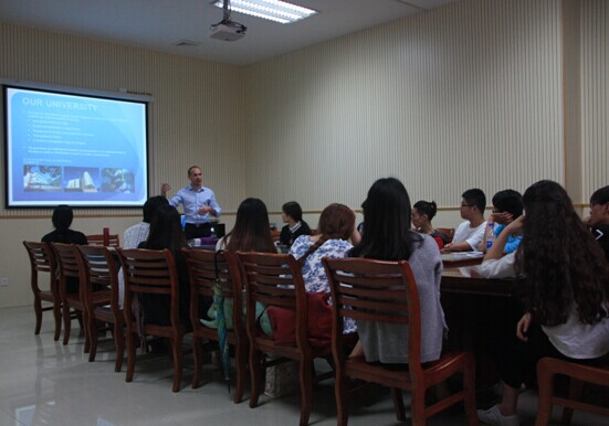 随后,面试老师与我院艺术项目大一的学生见面座谈。Olivier老师向同学们详细地介绍了南安普顿大学温彻斯特艺术学院的课程设置、师资配备、硬件设施等各方面的情况。同学们也就自己感兴趣的问题,比如住宿环境、奖学金、毕业展等问题与老师积极互动、交流。