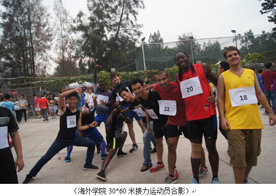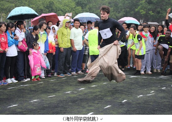 随后,举行了袋鼠跳接力。来自海外教育学院和国际学院的学生们积极参与,乐在其中。比赛进行到一半时天气转雨,但却丝毫不减同学们参与的热情。袋鼠跳接力让同学们深刻地体会到体育运动重在参与。