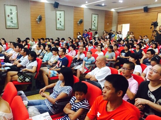 讲座现场,Robin老师主要从自己的学习生活经历方面谈了自己的一些感受,并与听众分享了他周游各地的生活。讲座现场有不少的家长带着学生聚精会神地听讲,场上不时爆发出阵阵掌声。在互动环节,听众竞相举手提问,而Robin老师更是走近观众席,与提问者面对面交流,点燃现场热情,将整场讲座推向高潮。