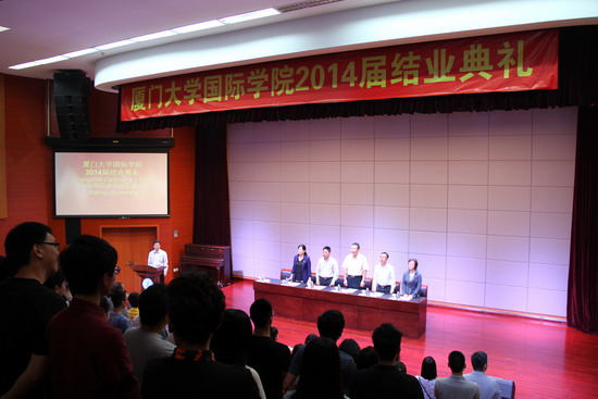 4月29日上午,翔安校区坤銮楼多功能报告厅内歌声嘹亮,掌声阵阵,国际学院2014届学生结业典礼在这里隆重举行。厦门大学校长助理李初环、国际学院院长郑通涛、党委书记陈志伟、党委副书记伍伟平、办公室主任黄冠华等学校及学院领导出席结业典礼。参加典礼的还有中国留学服务中心留学组,英国合作大学各代表,学院各部门负责人和2014届结业学生及家长。典礼由国际学院副院长吕子玄主持。