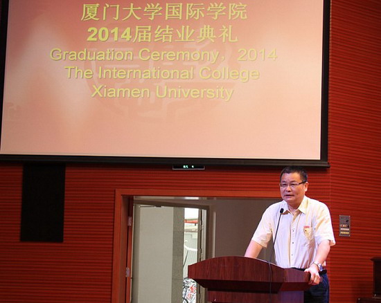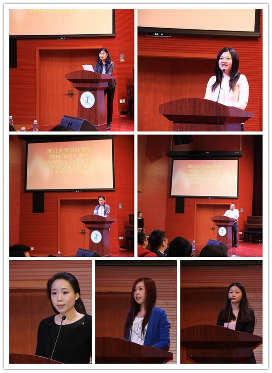 家长代表黄晓雯女士及周德聪先生上台讲话。黄女士感谢国际学院对孩子的悉心栽培,她说,国际学院提供了一个权威、规范、稳妥、多元化选择的留学平台,为学生的培养发展提供了极佳的园地。周先生则祝福即将出国的同学们带着厦门大学镌刻上的标记,发扬“自强不息,止于至善”的厦大精神,昂首走入社会。