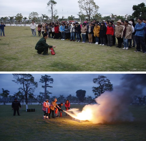 随后,胡队长组织同学们来到在1号楼前坪,消防官兵们向大家展示了灭火器的正确使用方法。同学们四人一组,认真进行实际灭火操作。