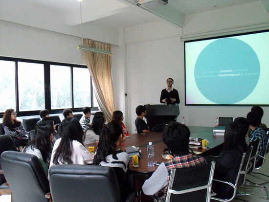 上午,Tim到达厦门大学漳州校区宾馆213室,为我院艺术项目师生开设讲座,介绍南安普顿大学温彻斯特艺术学院的地理位置、发展历史、校园生活、排名情况、课程设置及学习模式,在场学生无不为这图文并茂的讲座所吸引,表现出极大的兴趣。