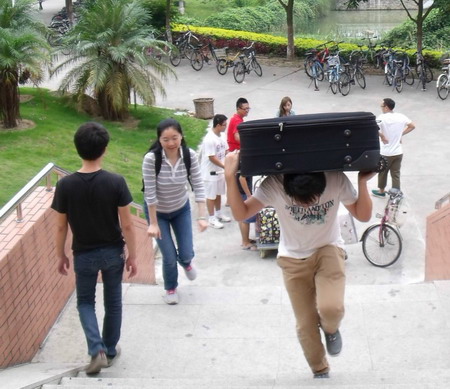 迎新现场,老师们细心地为新生办理注册手续,分发校园卡、学生证、宿舍钥匙及学生手册,并提醒新生注意入学周的安排。迎新志愿者们面带微笑,以自己的行动迎接着一张张青春的脸孔。当新生办完报到手续之后,志愿者们便接过新生和家长手中的行李,往行李车上搬。从报到处到宿舍,他们热情的为新生和家长指路,搬运行李,各个角落都有他们忙碌的身影,一张张诚挚的脸上绽放着灿烂的笑容,是那么的可爱。