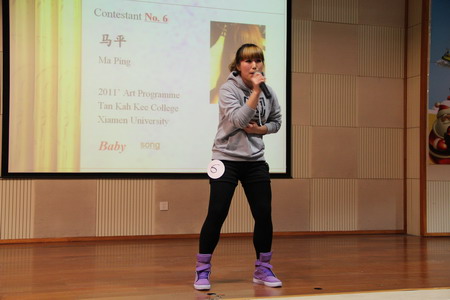 在歌曲比赛部分,嘉庚学院艺术设计系2011级的马平同学以一曲热情的“Baby”夺得了一等奖;国际学院都柏林项目的郑伟、付雪颖获得二等奖;国际学院伦敦大学项目的丁少雄、预本硕连读项目的吴燕霞、艺术设计项目的俞若文获得三等奖。