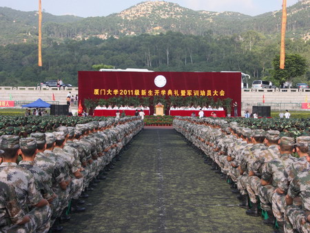 承训部队领导、厦门警备区领导、漳州军分区领导,我校领导陈力文、陈国凤、吴世农、李建发、邬大光、赖虹凯,党委常委、组织部部长白锡能,校长助理韩景义、李初环、陈应鑫,嘉庚学院院长王瑞芳,常务副书记鲁同安,学校机关各部处负责人、各学院党政领导、师生代表及2011级8600多名新同学参加了典礼。典礼由校长助理、漳州校区党工委书记、管委会主任王巧萍主持。