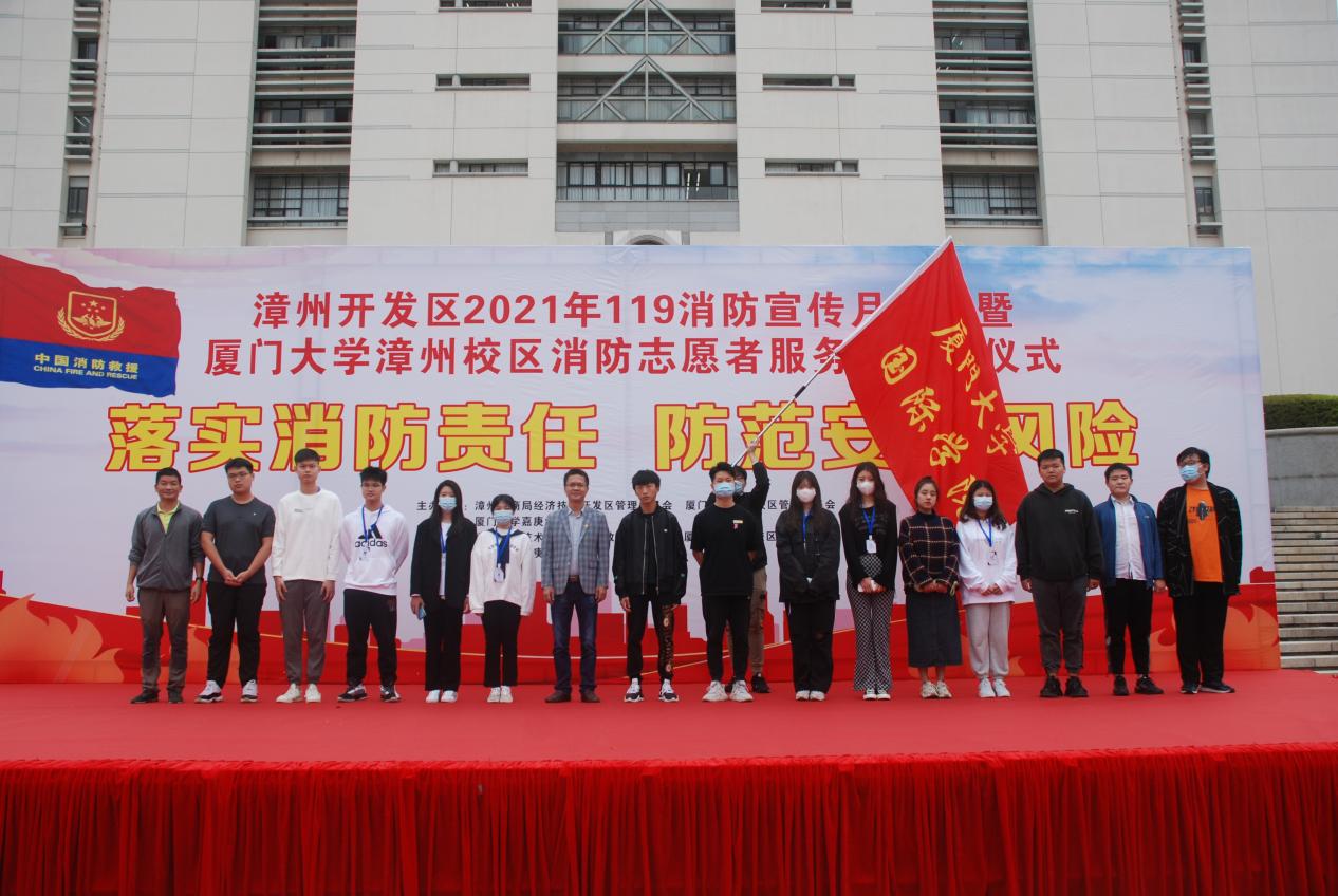 演练结束后,举行招商局漳州开发区——厦门大学漳州校区2021年“119”消防宣传月启动仪式暨厦门大学漳州校区消防志愿者服务队授旗仪式。