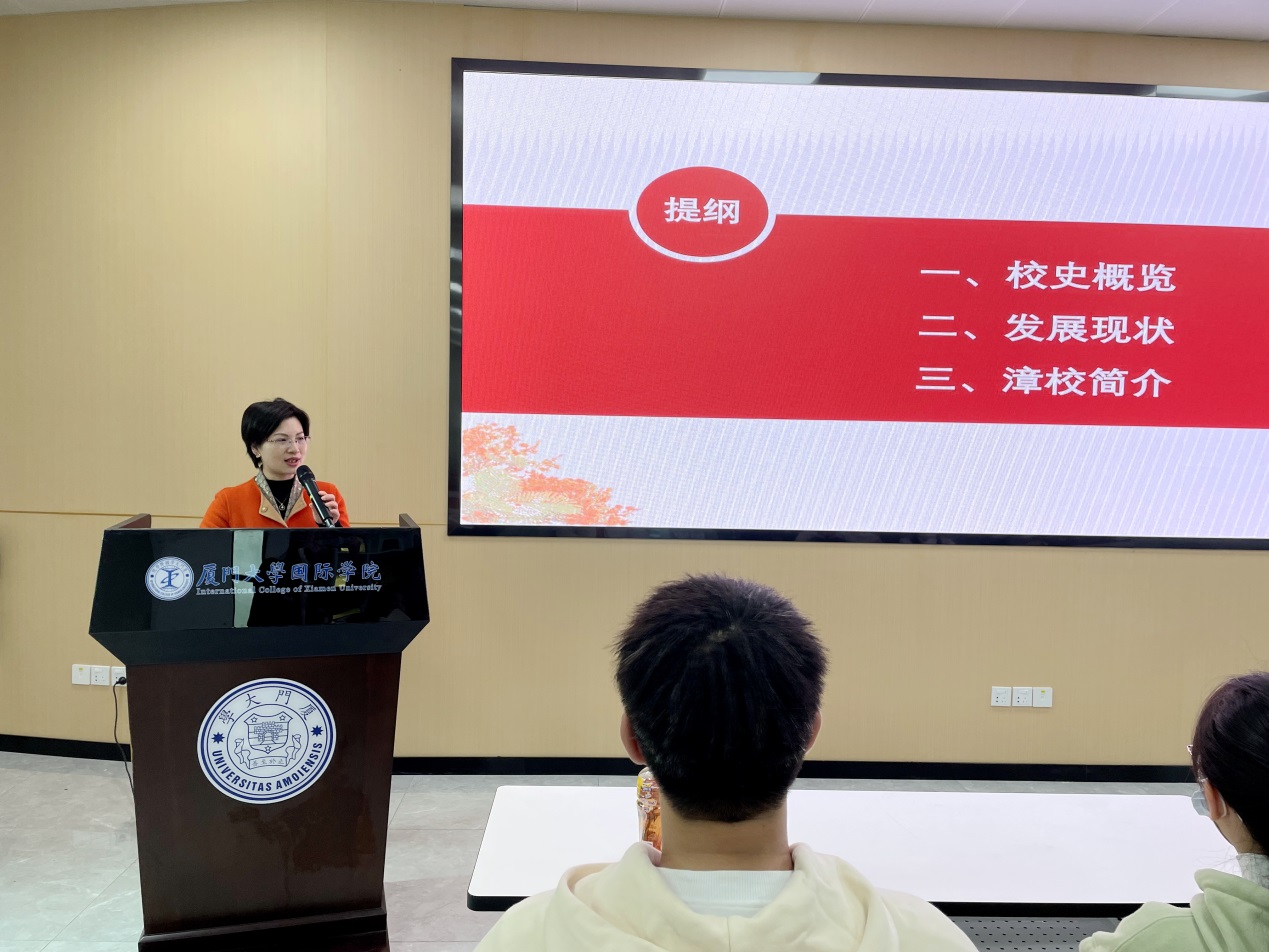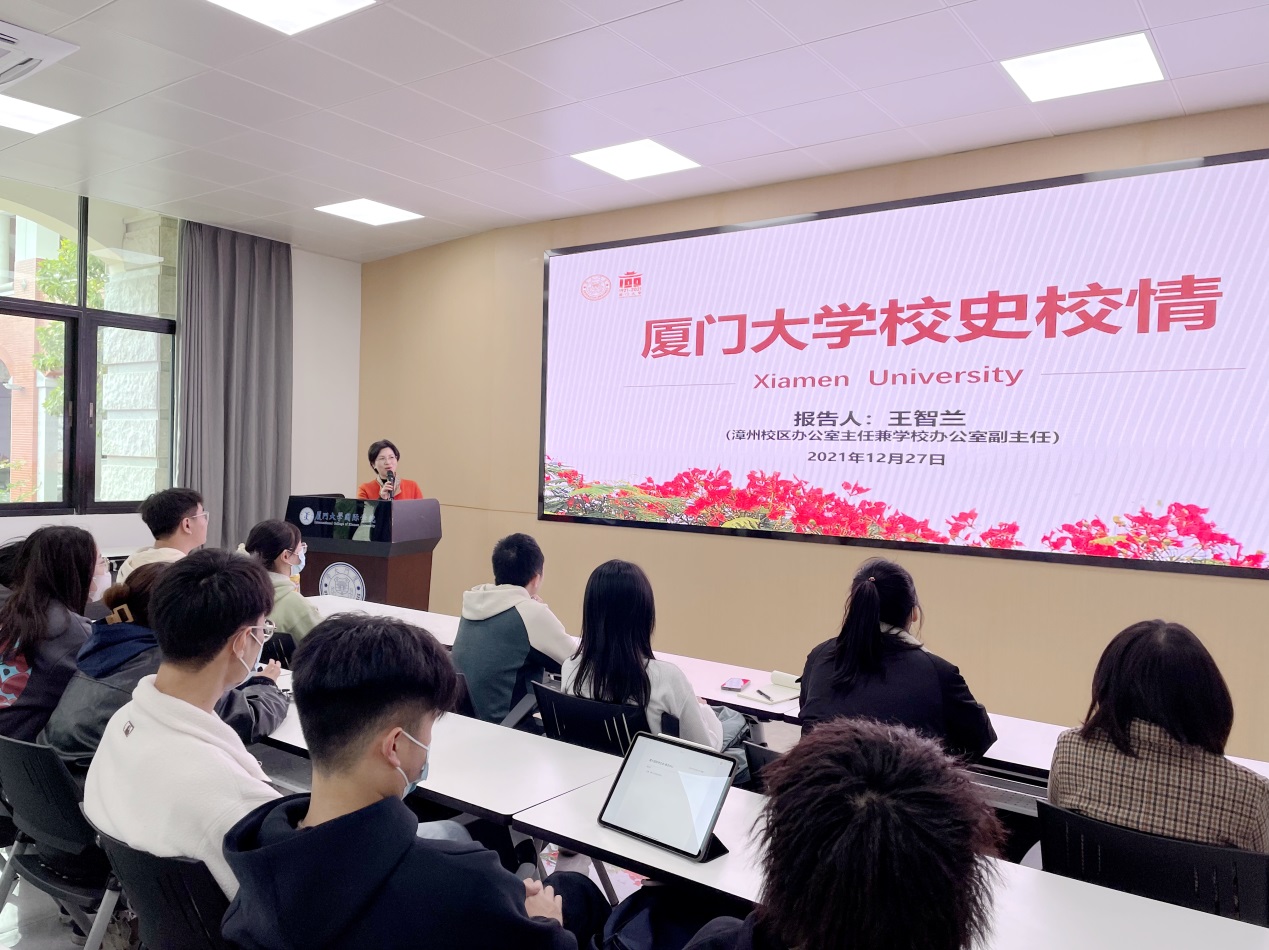 12月27日下午,国际学院于主楼4号楼101会议室举办青年志愿服务中心培训讲座。厦门大学漳州校区办公室主任兼学校办公室副主任王智兰老师作为本期培训讲座嘉宾,为青年志愿服务中心全体同学做了《厦门大学校史校情》专题报告,帮助同学们进一步了解学校及漳州校区的基本情况。