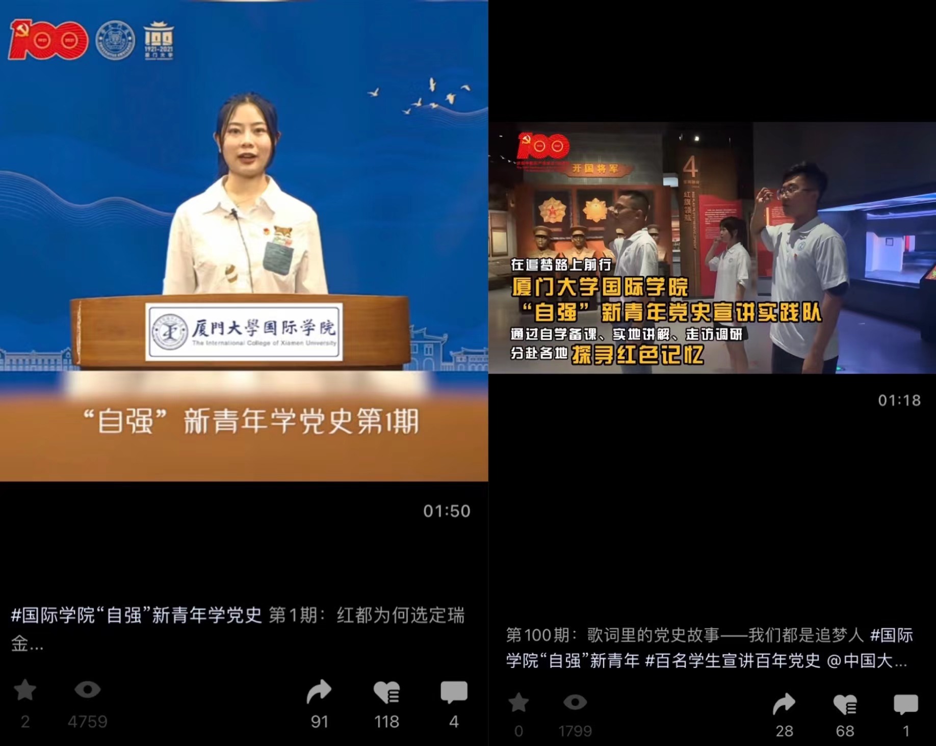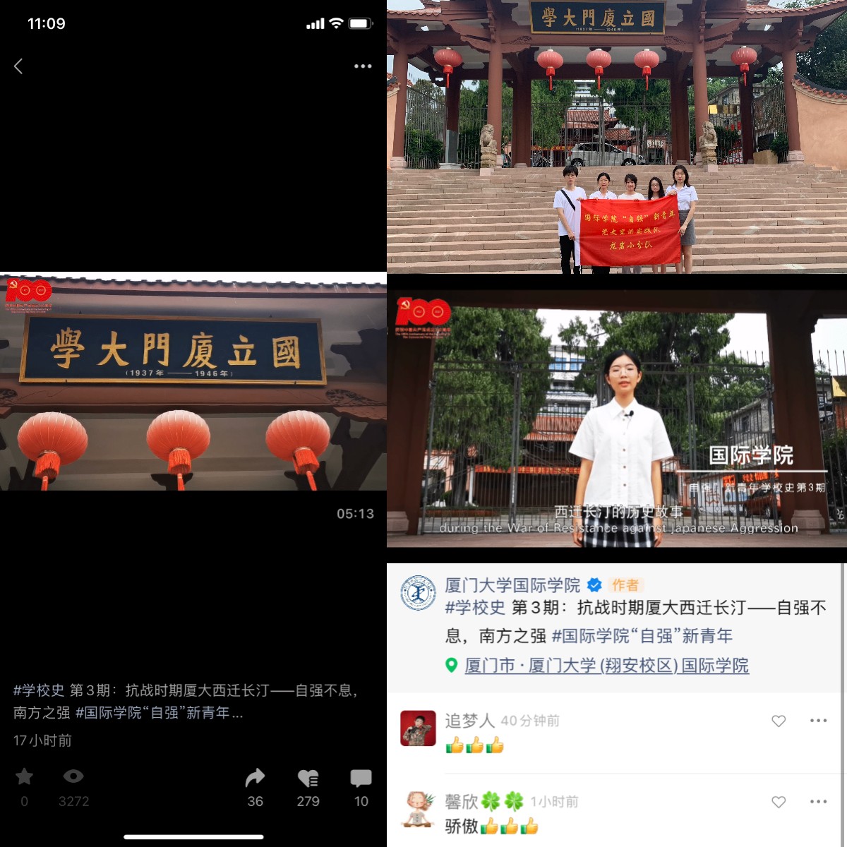 习近平总书记在贺信中,指出厦门大学是一所具有光荣传统的大学。100年来,学校秉持爱国华侨领袖陈嘉庚先生的立校志向,形成了“爱国、革命、自强、科学”的优良校风。一年来,为持续深入弘扬四种优良校风,国际学院立足师生专业优势,推出“自强新青年”学校史栏目,组织青年学子深入挖掘校内红色资源,赓续百年厦大的红色精神血脉,用英文讲述陈嘉庚先生爱国兴学、罗扬才烈士投身革命、厦门大学自强不息西迁办学、校长王亚南矢志翻译《资本论》、陈景润先生勇攀科学高峰、高捷成首创红军会计工作制度等故事。6期宣讲微视频一经国际学院视频号发布,便在师生中广泛传播,浏览量达4.6万余次,其中,《红色金融家——厦大1927级校友高捷成》宣讲微视频更是获得了高捷成后人的点赞肯定,极大激发了全院师生的爱国之情、报国之志,极大增强了作为厦大人的自豪感、使命感和责任感,为学校国际化办学、一流大学建设贡献青春力量。