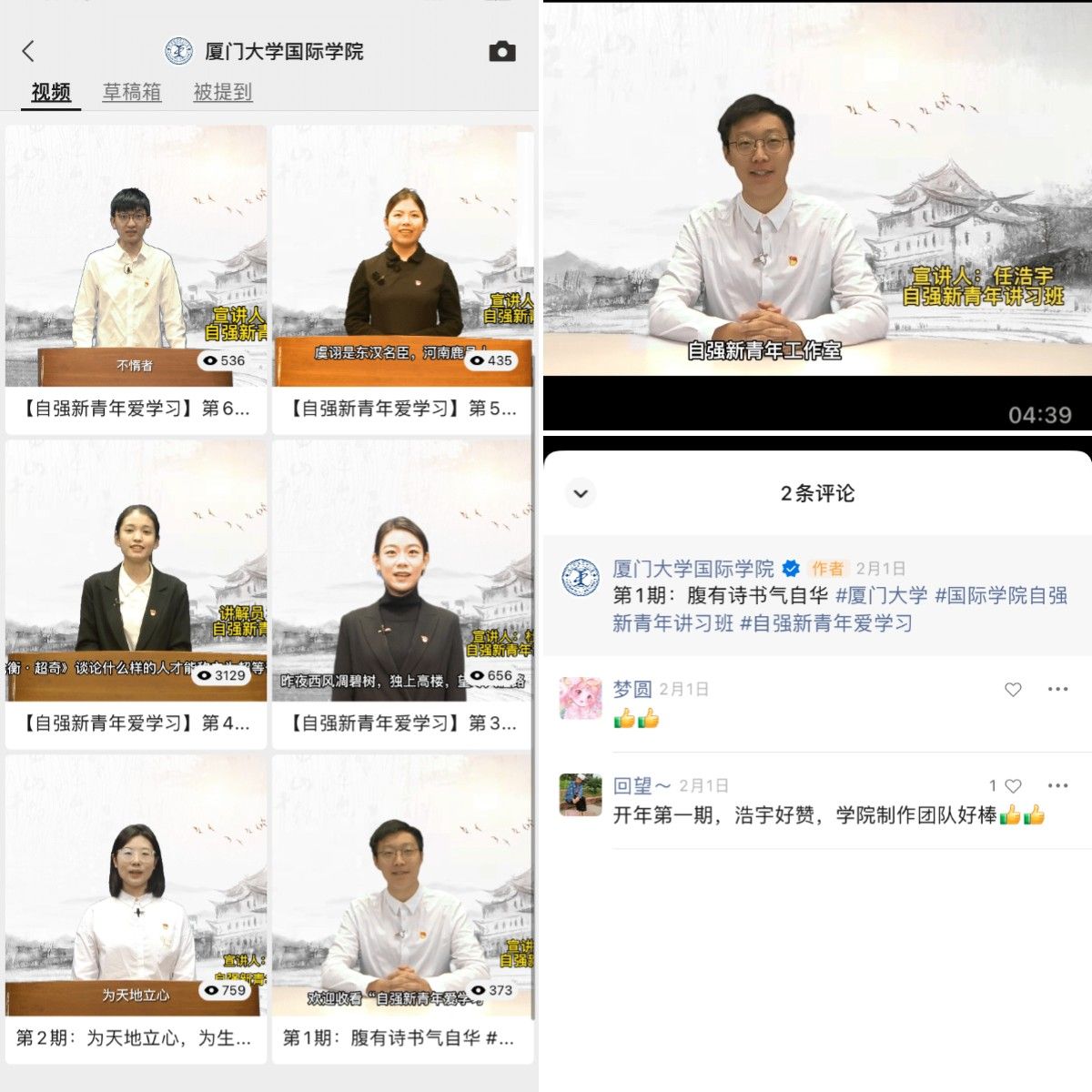 积累一定品牌影响力后,国际学院继续深入挖掘视频号网络育人功能,组织录制发布《自强新青年微学堂》,全体学生党员积极参与评论,热议党的百年奋斗重大成就和历史经验,深入学习党的十九届六中全会精神,汲取奋进力量。