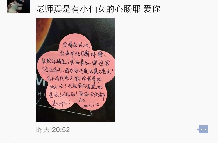 在学生看来,曾老师更像是一位知心大姐姐,在课堂上教学亲切没有距离感,课后也时时把学生记挂在心上。在每个学年的最后一节课上,曾老师都会给每位学生准备一份特别的礼物——她亲手写的卡片,里面有对这个学生的初步印象、对学生优点的欣赏和对学生未来的寄语。