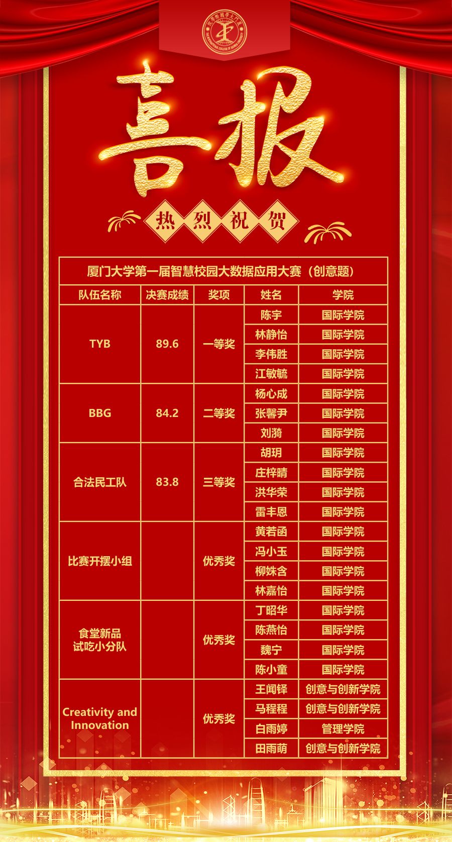 近日,厦门大学第一届智慧校园大数据应用大赛落下帷幕。历时2个多月激烈的比拼和线上专家答辩,国际学院参赛团队包揽了大赛(创意题组)的各类奖项,其中一等奖1项、二等奖1项、三等奖1项、优秀奖2项。不论从获奖数量,还是从获奖等级来看,我院均以明显优势遥遥领先!