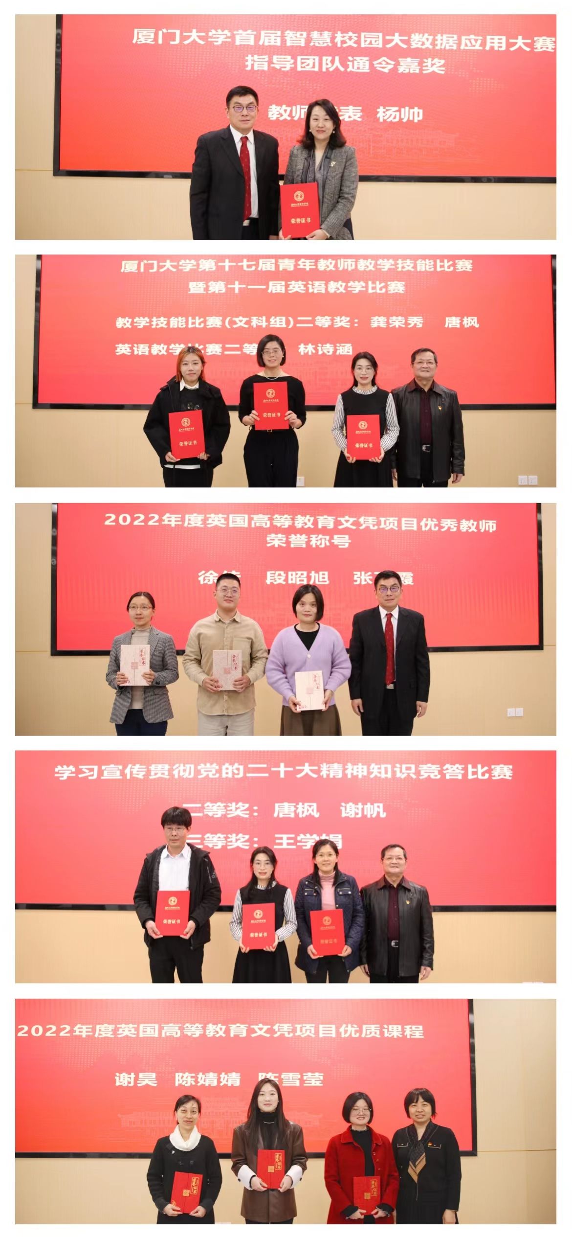 最后,学院对2022年秋季学期以来获得校级、英国苏格兰高等教育委员会(SQA)奖项的教职员工进行表彰,特别给予指导学生获得厦门大学第一届智慧校园大数据应用大赛各类奖项的教师指导团队通令嘉奖。