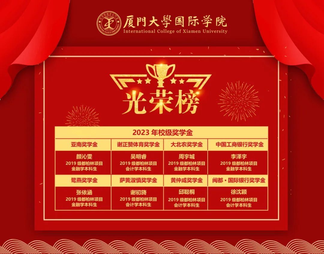 本次2023年度校庆期间校级奖学金评审中,学院都柏林项目本科还有其他7位优秀学生获得表彰:金融学专业周宇城获“大北农奖学金”,金融学专业李泽宇获“中国工商银行奖学金”,金融学专业张依涵获“鹭燕奖学金”, 会计学专业谢初旖获“萨黄淑慎奖学金”,会计学专业邱聪桐获“黄仲咸奖学金”,会计学专业徐沈颖获“闽都·国际银行奖学金”和会计学专业吴明睿获“谢正赞体育奖学金”。