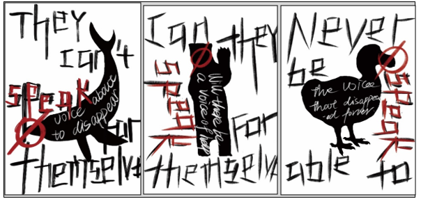 2021级林键淇同学的获奖海报作品《Speak》。这组系列海报分别是由脆弱、濒危和灭绝的动物设计而成,它们分别生活在海里、陆地和空中,受到了人类的危害,无法为自己的生命安全发声。海报主要是呼吁人类保护动物。