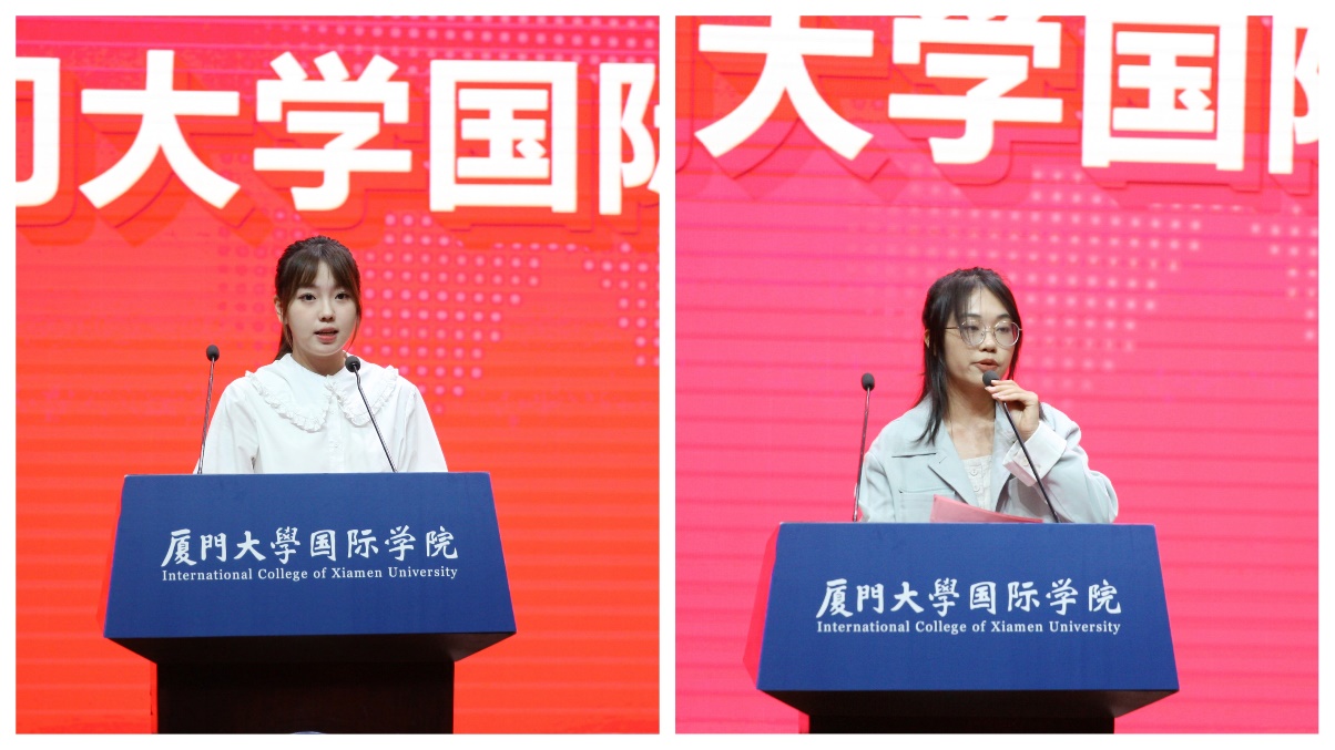2022级学生胡凯迪和2023级新生杨珂语分别作为在校生代表和新生代表发言。胡凯迪代表全体学长学姐向来自五湖四海的2023级新生表示热烈的欢迎和真挚的祝福,结合在校学习生活感受,她希望新生们好好珍惜大学时光,制定清晰的学业规划,努力提升综合素养,积极参加各项活动,珍惜每一个锻炼和提升自己的机会。杨珂语代表全体新生表示厦大是新国际学子们人生的新驿站、新起点、新篇章,他们将秉承厦大“自强不息,止于至善”的校训,严格律己,刻苦学习,砥砺奋进,不负青春韶华。