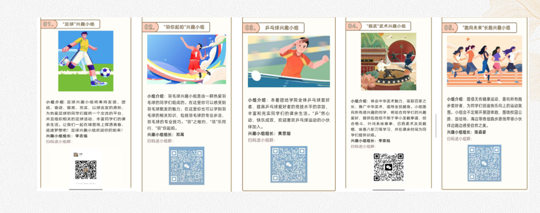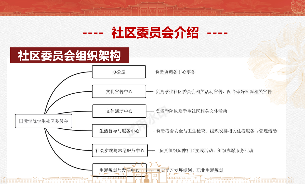 辅导员以“涂抹青春色彩,共建团队生活”为主题向新生介绍了学院社区委员会的组成、各个部门的职能,以及围绕社区委员会开展的各类活动。文化宣传部接受学院老师的培训和指导,记录各项活动的精彩瞬间;文体活动中心组织学院同学参加篮球赛、运动会等体育赛事;生活督导与服务中心负责督导学院同学遵守行为规范,协助老师一同检查宿舍社区的卫生和安全问题;社会实践与志愿服务中心协调学院同学参加志愿服务活动,假期社会实践活动等等……学院为丰富学生社区团体活动,充分发挥同学们的兴趣爱好,还设立了足球、“羽你起拍”(羽毛球)、乒乓球、“振武”(武术)、“跑向未来”(跑步)等兴趣小组,为具有不同兴趣的同学们搭建了活动和交流的平台。
