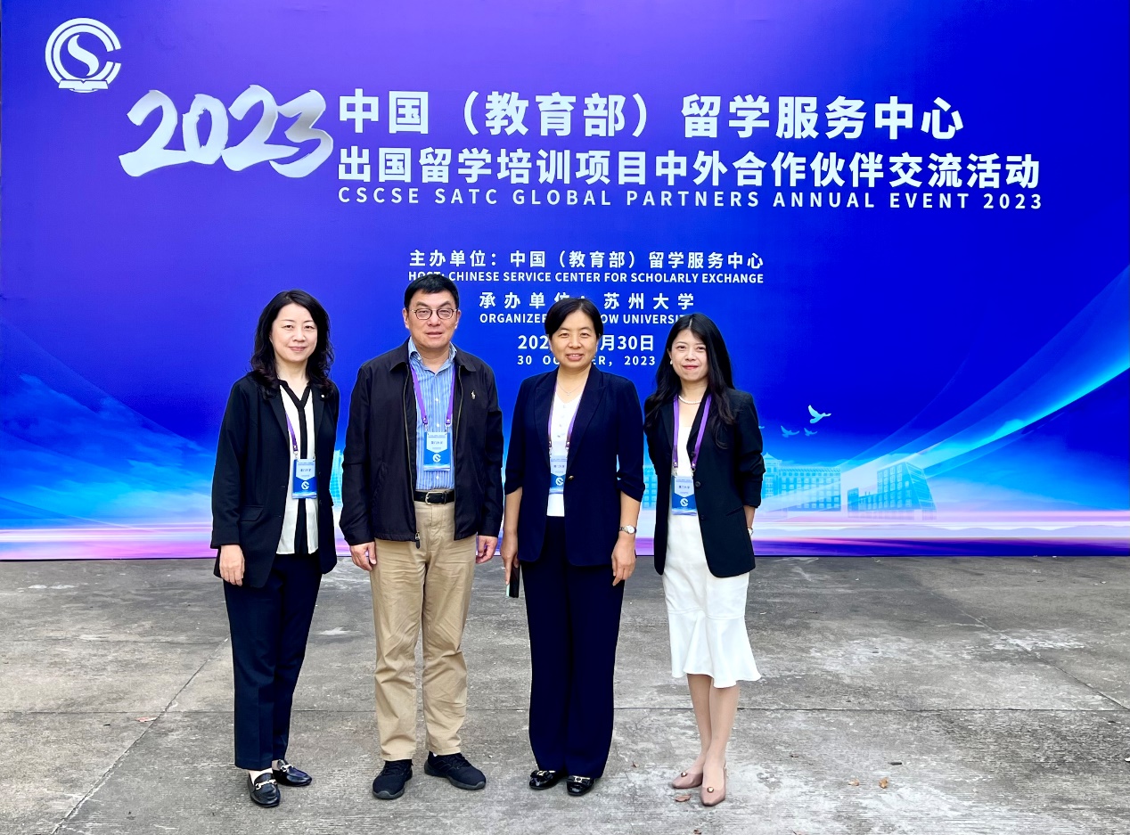 为推进中外高校间的交流与合作,促进出国留学项目高质量发展,10月30日,中国(教育部)留学服务中心在苏州大学举办2023出国留学培训项目中外合作伙伴交流活动。来自国内55所国内院校和38所海外院校的200余位代表参加活动。作为国内院校代表,国际学院院长陶涛教授、党委副书记马向华、日语教研组组长闫飒和项目协调员陈健茹一行四人前往苏州大学参加活动。