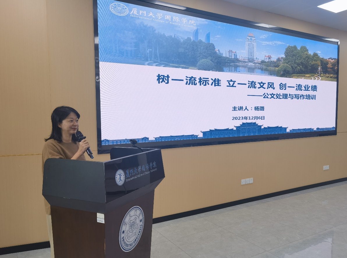 为提高学院党政人员的管理服务能力,提升专业水平和职业素养,12月6日上午,厦门大学办公室秘书杨璐老师应邀来我院开展题为“树一流标准 立一流文风 创一流业绩――机关公文处理与写作”的专题培训。培训会由学院办公室主任艾浩主持。