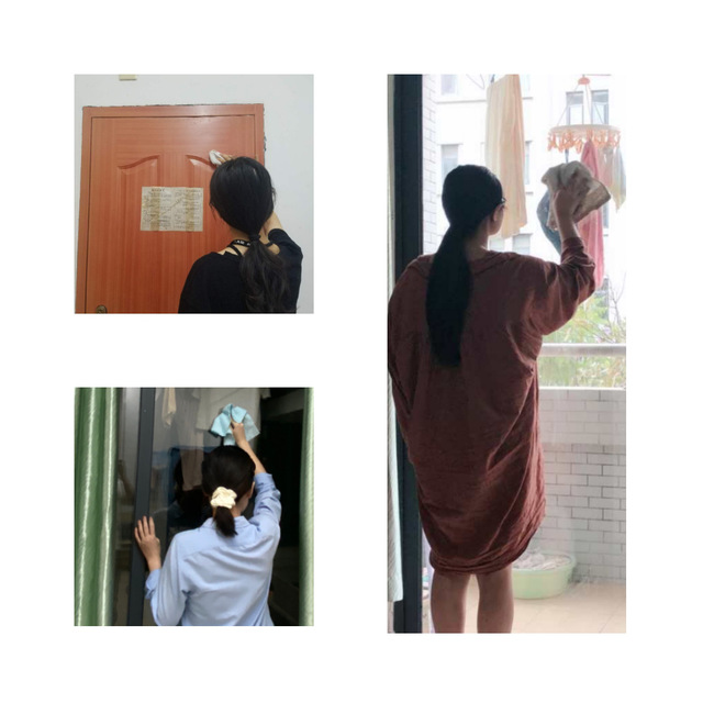 宿舍的边边角角也不能放过,学生党员将宿舍的门与窗仔细的擦洗,门窗被擦洗的干净明亮